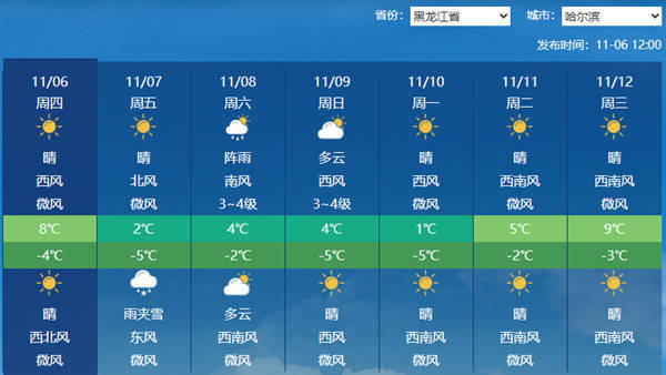 r具体来看,黑龙江省气象台预计,今天夜间到明天白天,伊春南部、佳木斯东部、七台河、鸡西、牡丹江北部多云有分散性雨夹雪,其它地区晴有时多云。大兴安岭北部、黑河北部、伊春北部明天白天最高气温在-5至-3℃,大兴安岭南部、黑河南部、伊春南部、绥化北部、鹤岗、佳木斯东部-3至-1℃,大庆南部、牡丹江南部2至4℃,其它地区0至2℃。