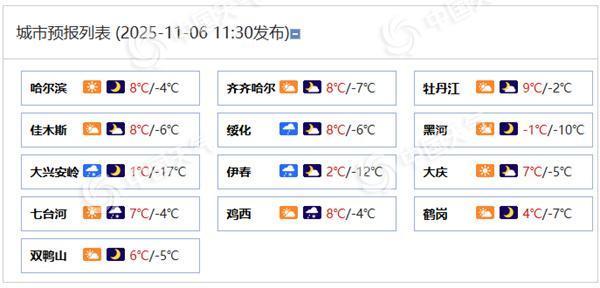 黑龙江各城市今日天气预报。(来源:中国天气网)